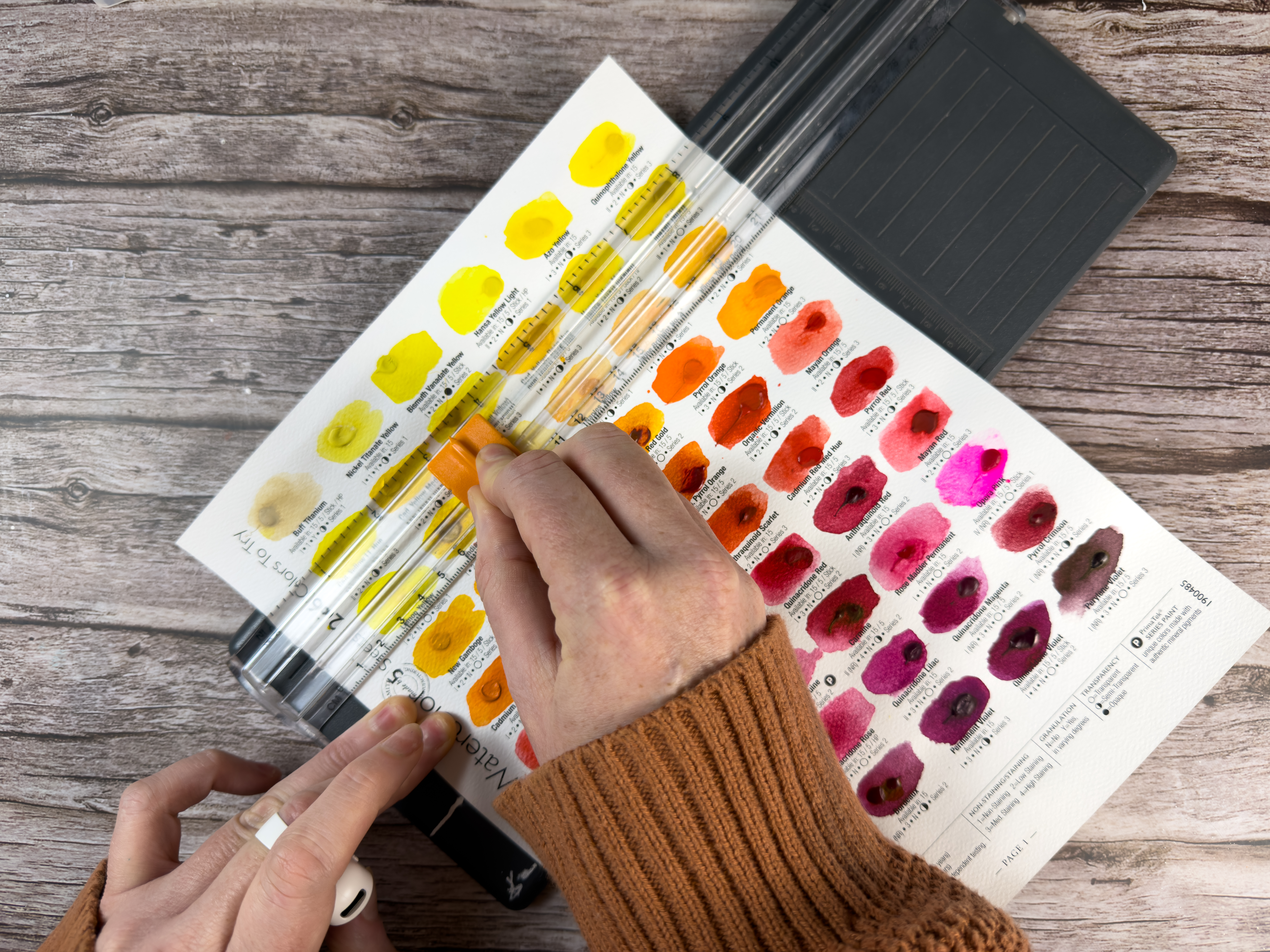 I like cutting them so each strip holds a neat row of color dots—small enough to flip easily, but large enough to clearly see the color names. I cut mine into sections of 12 colors for each card. Just for aesthetics, I rounded the edges with a corner punch.