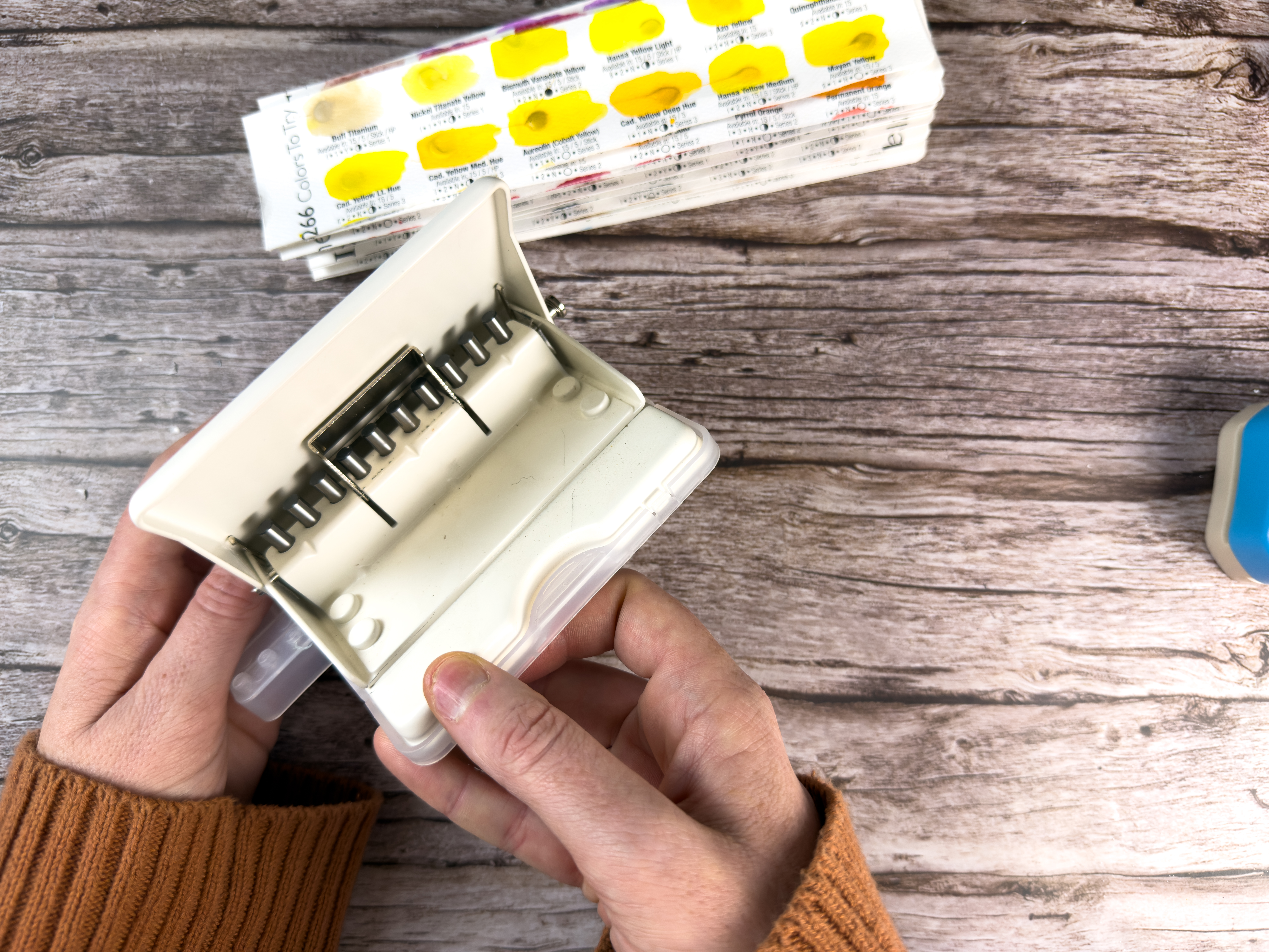 Once trimmed, stack a few cards at a time and punch holes along one edge. A multi‑hole punch makes this quick and keeps everything aligned, but a standard hole punch works just fine—just take your time.