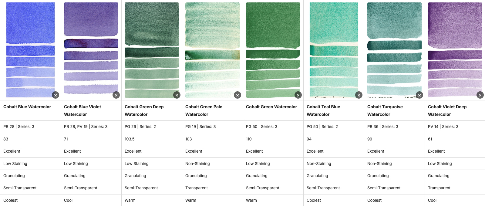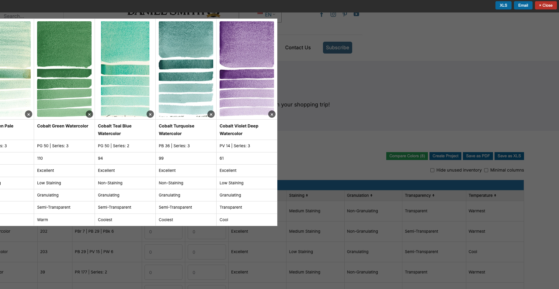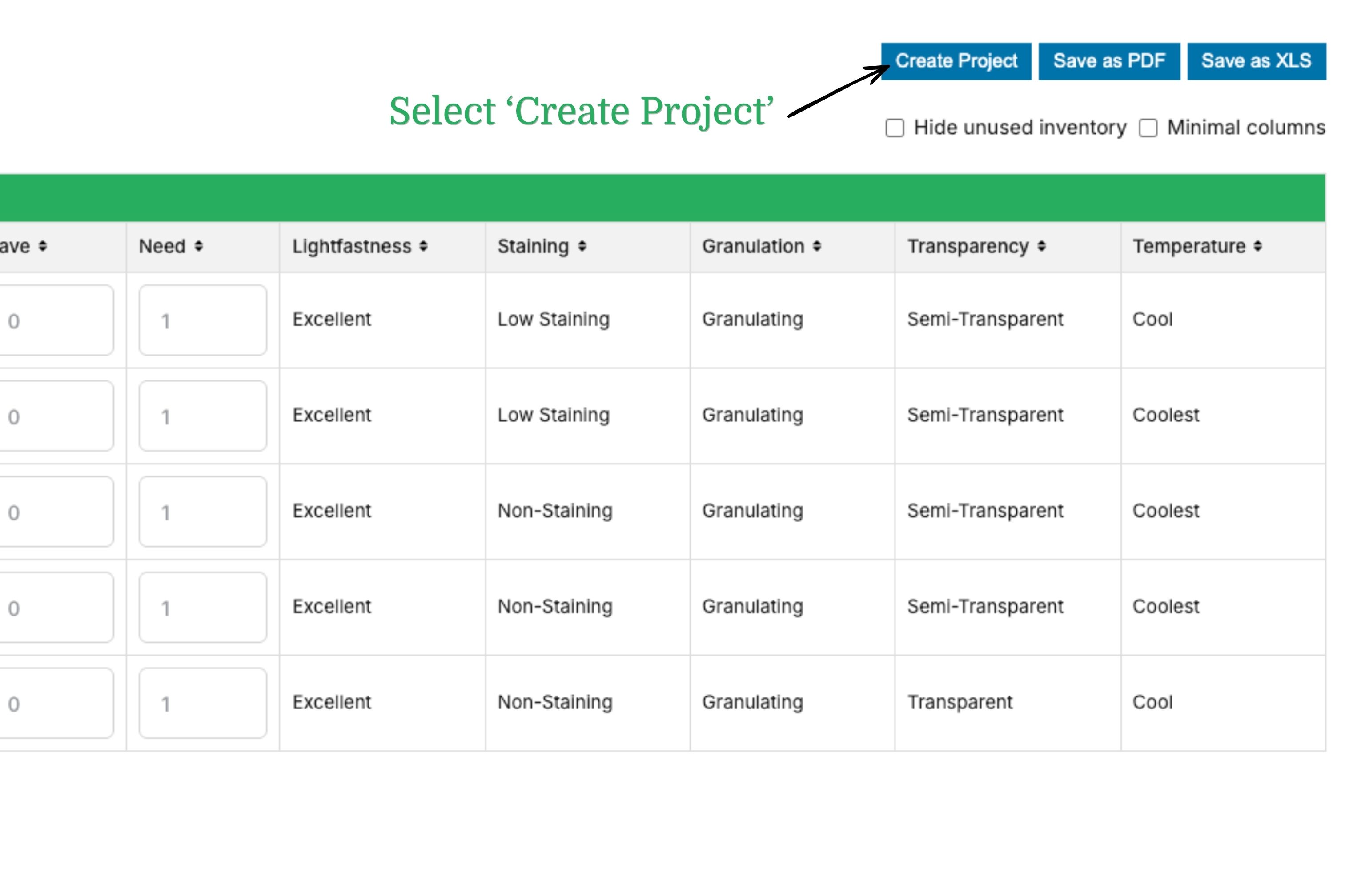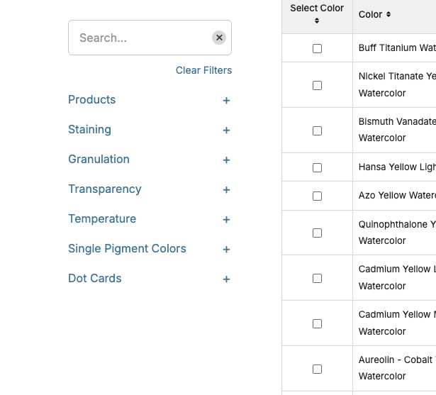 - Haz clic en los colores para explorar sus características y propiedades. Marque la casilla situada a la izquierda del nombre del color/producto para seleccionarlo.