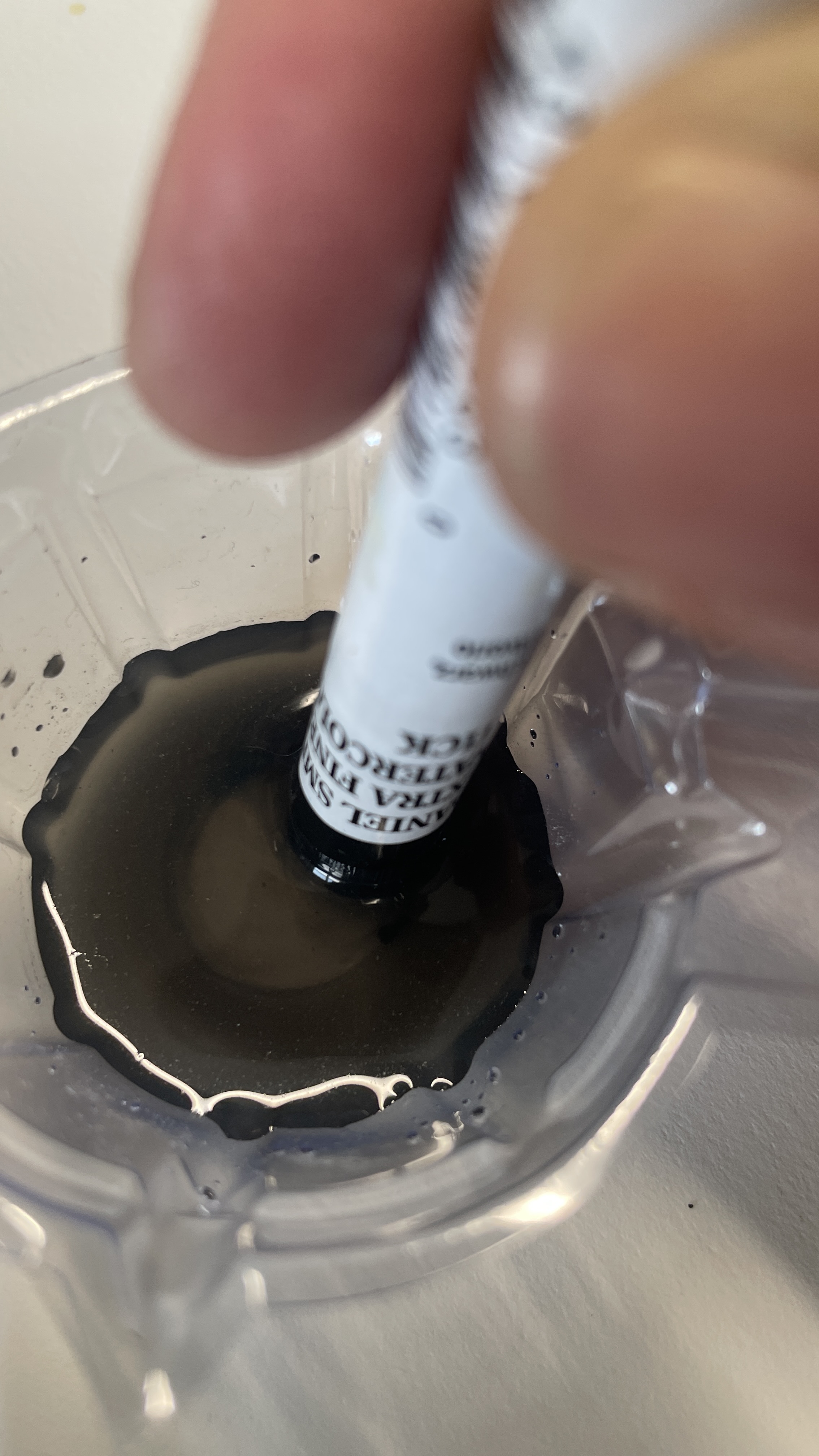 Après dilution, j'ai versé le tout dans le récipient de mon aérographe et j'ai effectué des tests de pulvérisation pour vérifier la dilution.