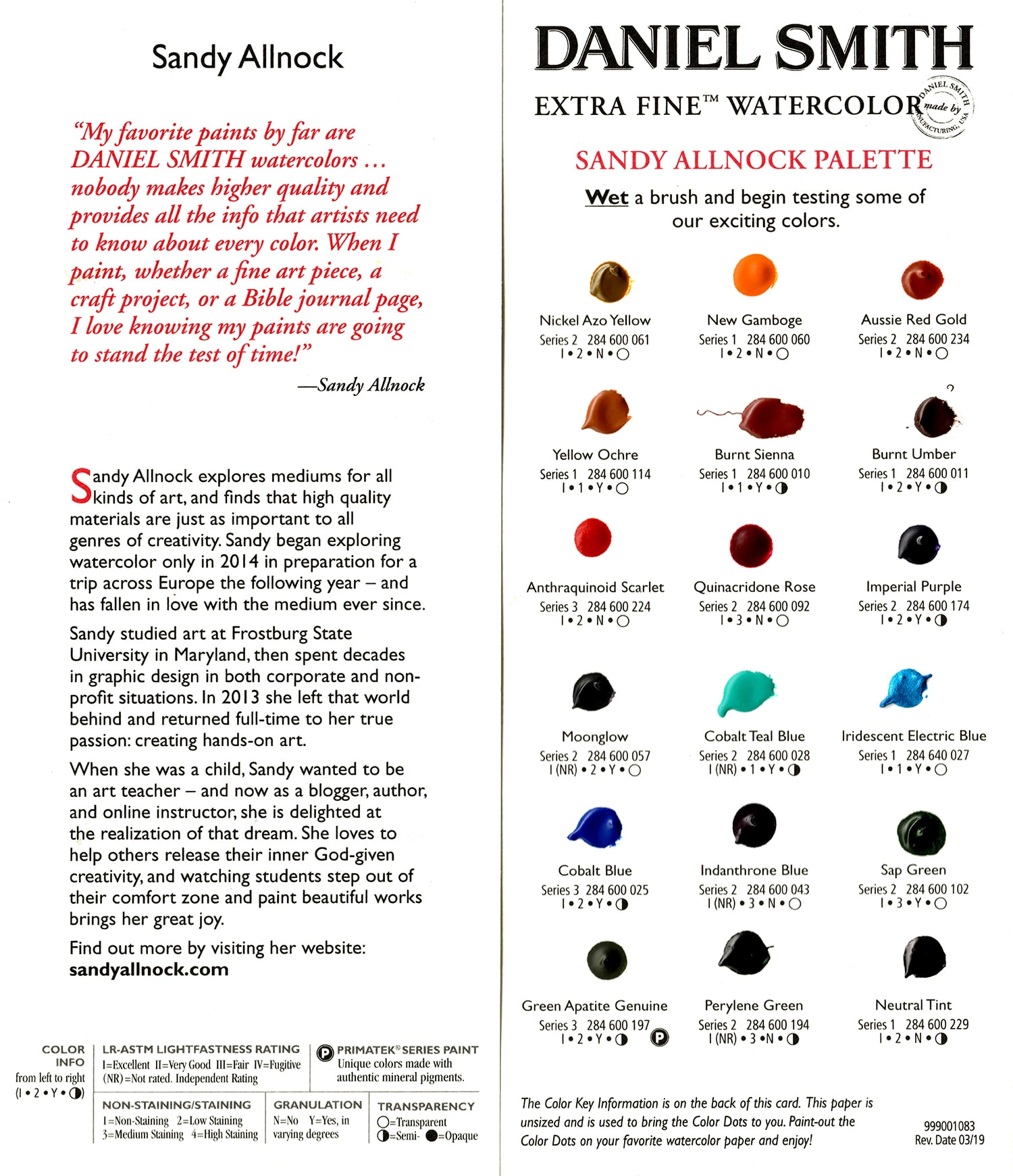 “"I miei colori preferiti in assoluto sono gli acquerelli DANIEL SMITH... nessuno produce colori di qualità superiore e fornisce tutte le informazioni che gli artisti devono conoscere su ogni colore. Quando dipingo, non so mai se quell'opera si rivelerà un'opera di prova da mettere da parte... o un capolavoro da custodire per sempre. È fondamentale utilizzare sempre materiali che resistano alla prova del tempo, nel caso in cui stia creando un'opera da conservare!"”