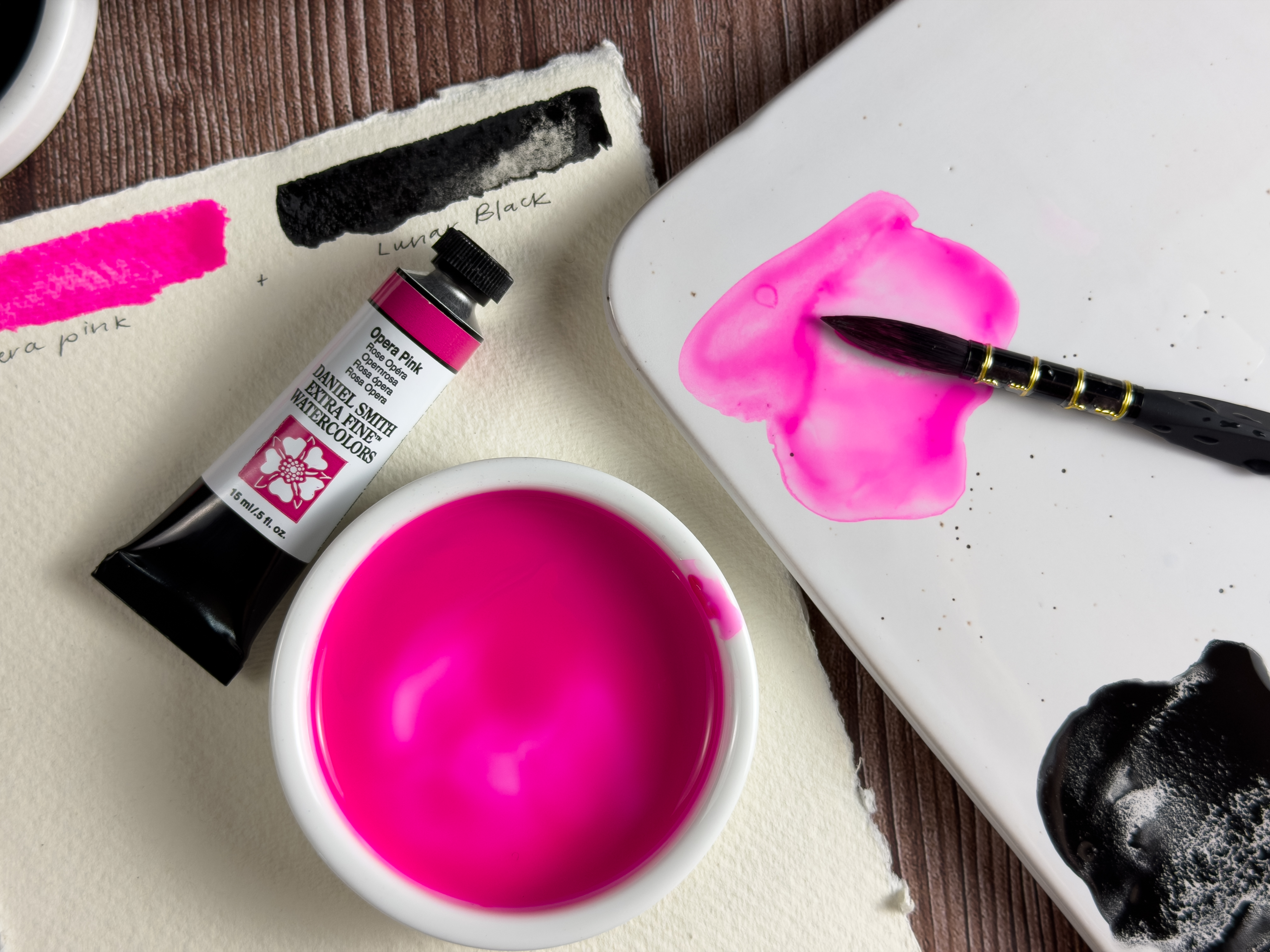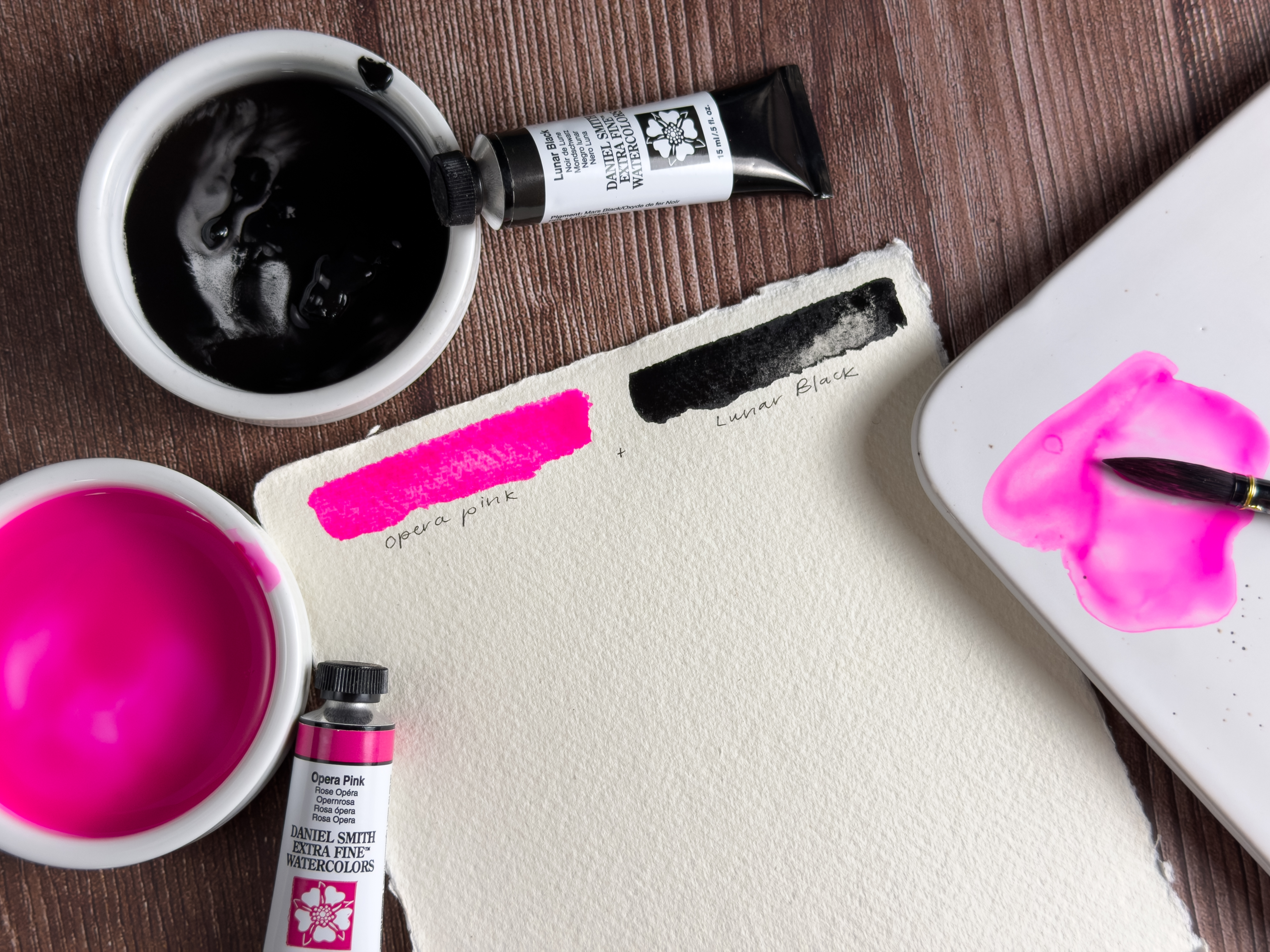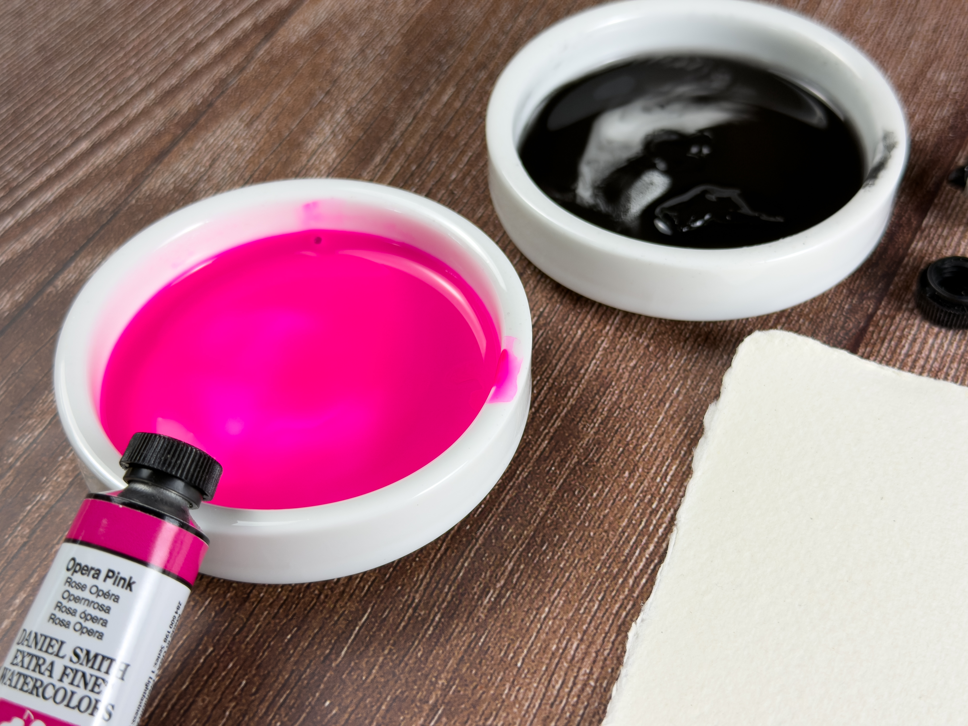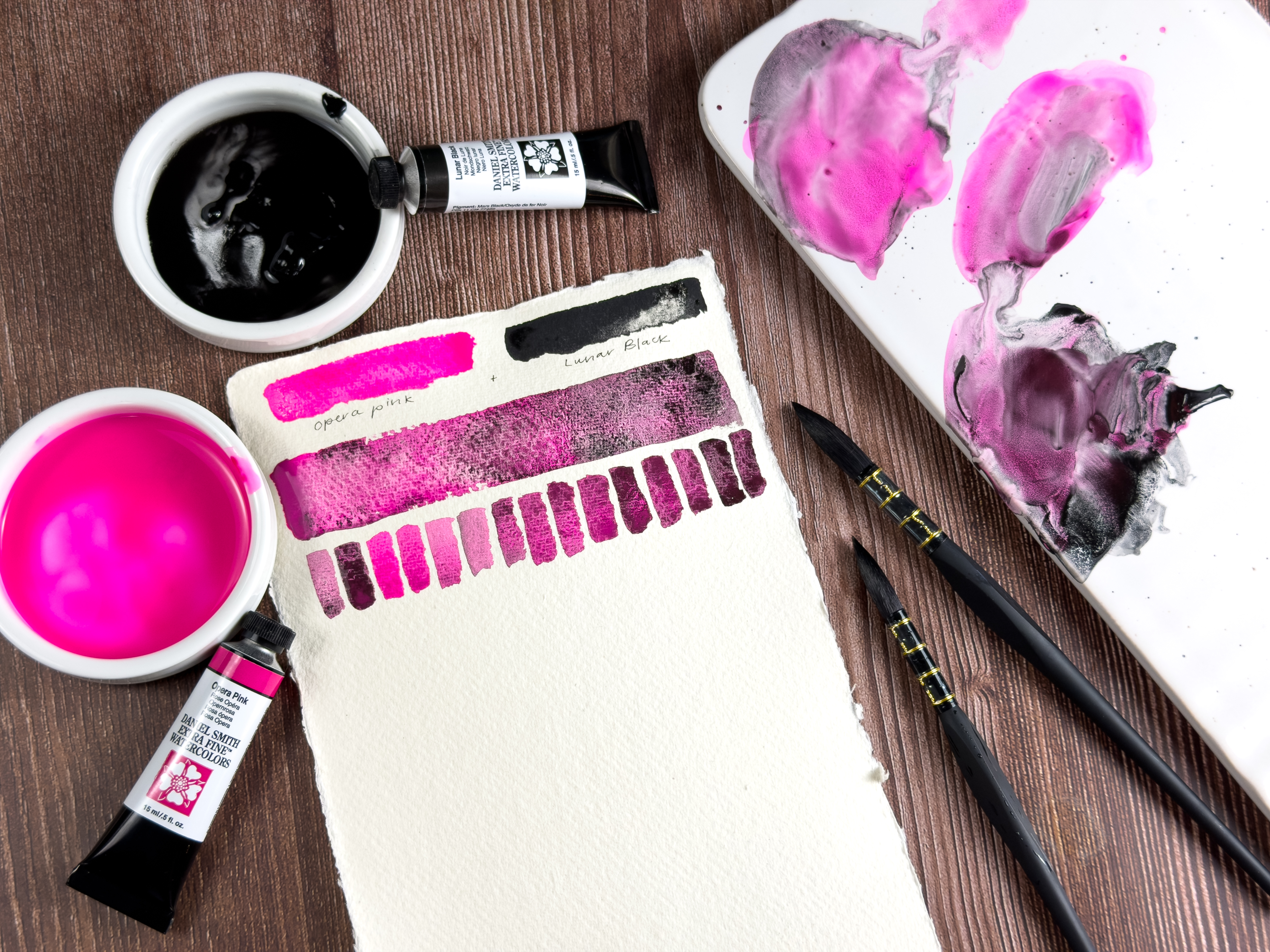 In deze aflevering van ons Recept voor het mengen van aquarelverf In deze serie verkennen we de onverwachte harmonie tussen twee gedurfde tegenstellingen: Opera Pink en Lunar Black. Gecombineerd creëren deze pigmenten een diep, korrelig violetzwart dat prachtig wisselt tussen gloeiende ondertonen en textuurschaduwen. Het is een mix vol drama en nuance – even geschikt voor expressieve bloemen, sfeervolle sferen en rijk gelaagde studies op zowel koudgeperste als warmgeperste papiersoorten.