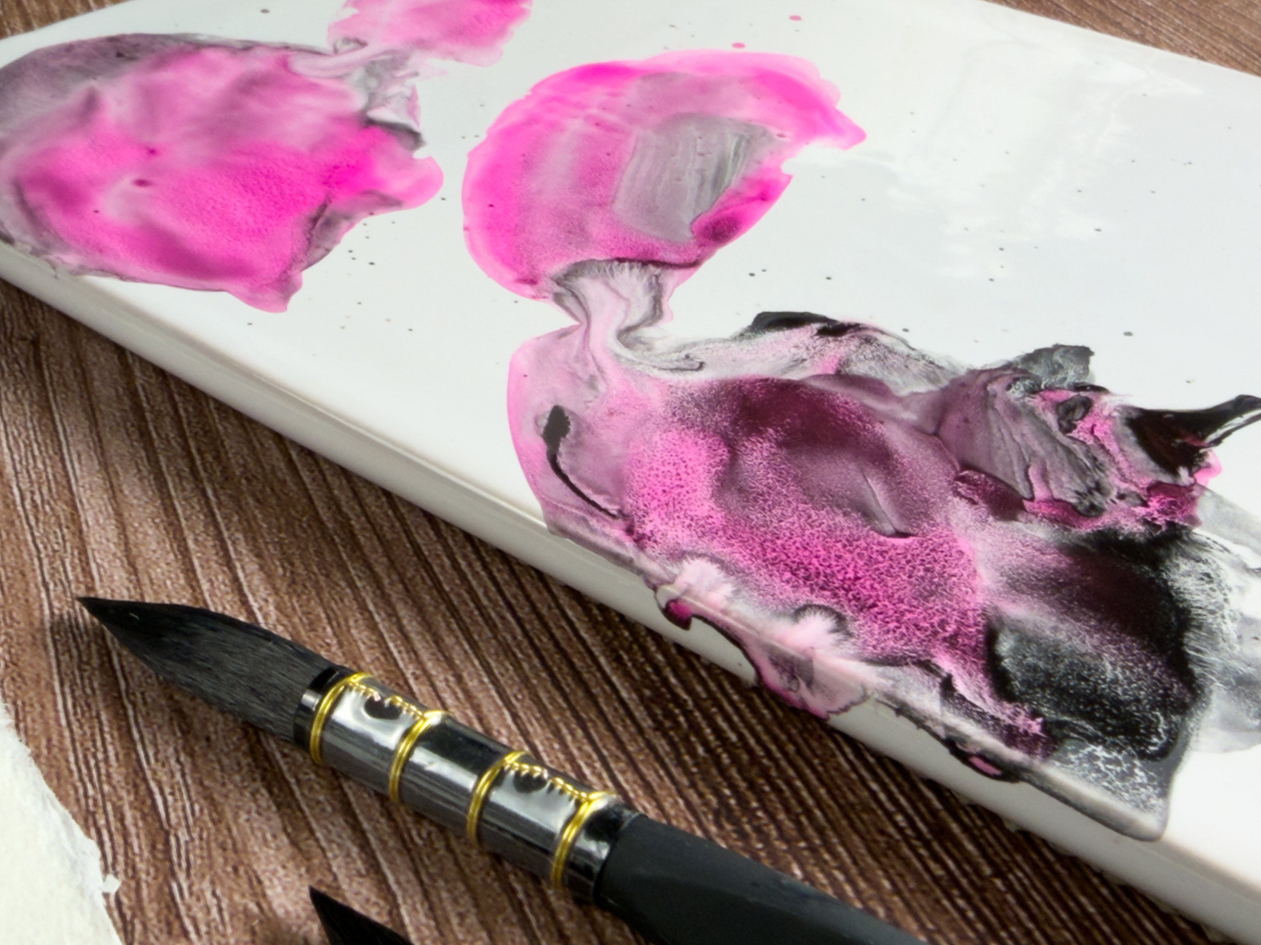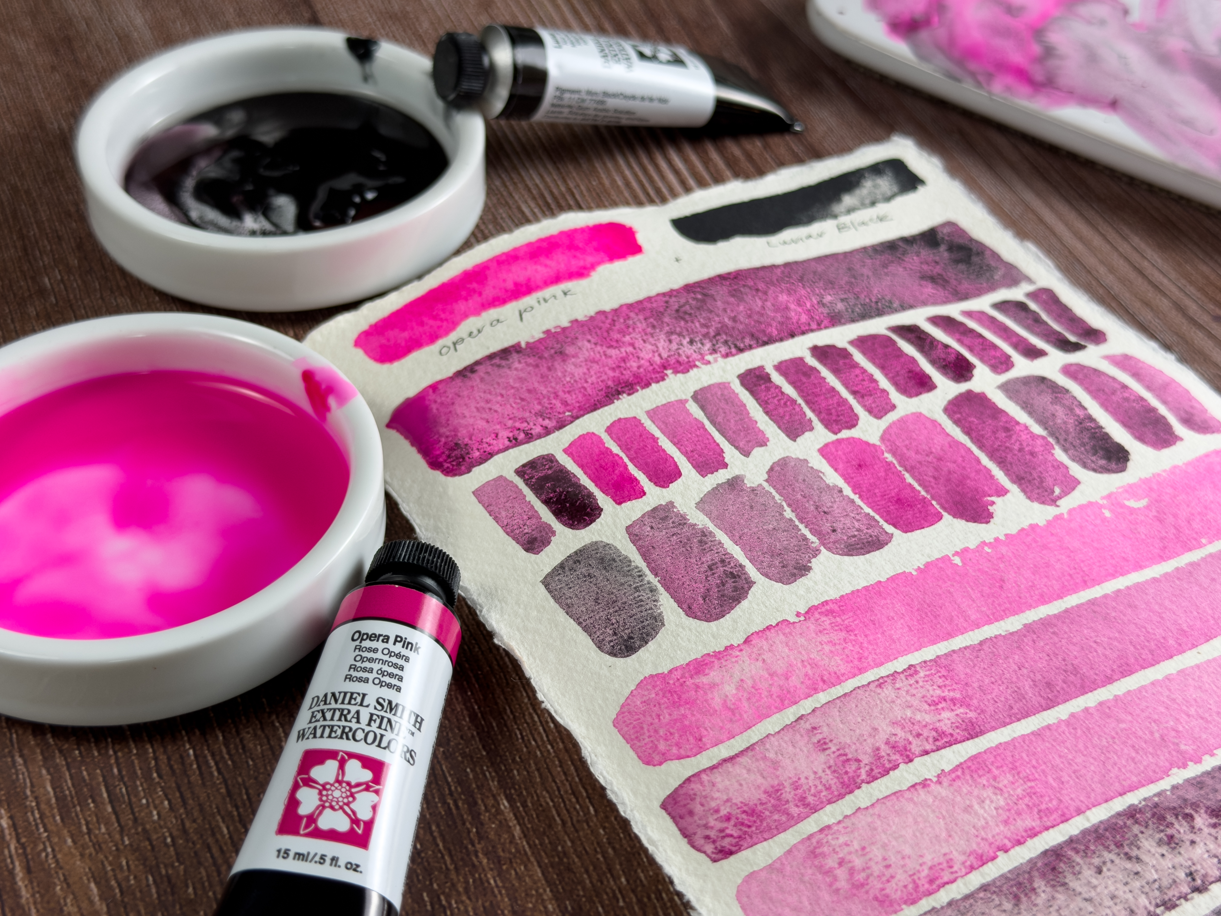 Zodra je Opera Pink en Lunar Black uit de tube en op je palet hebt gedaan, volgen hier een aantal mengrecepten en experimenten. Ook vertellen we je waar je op moet letten, afhankelijk van het type papier.