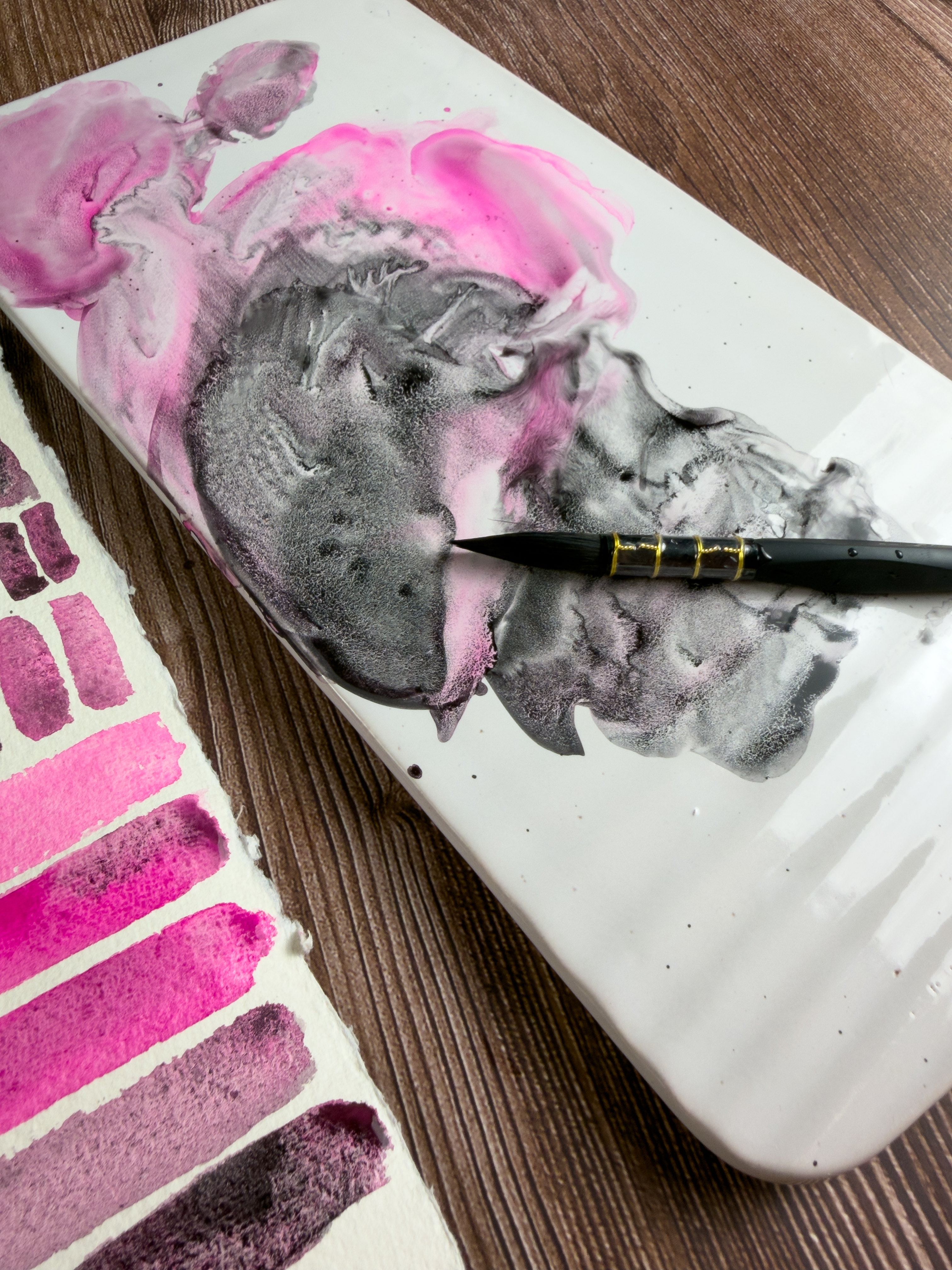 We hopen dat deze onverwachte combinatie van Opera Pink en Lunar Black je inspireert om de diepe, korrelige violetzwarte mengsels te ontdekken die je met alleen deze twee pigmenten kunt maken. Probeer de recepten op verschillende papiersoorten, pas je verhoudingen aan en zie hoe de kleuren verschuiven en bezinken. Deel je resultaten met ons als je experimenteert – we zijn benieuwd wat je creëert. Tag ons op social media zodat we je aquarelavontuur kunnen volgen!