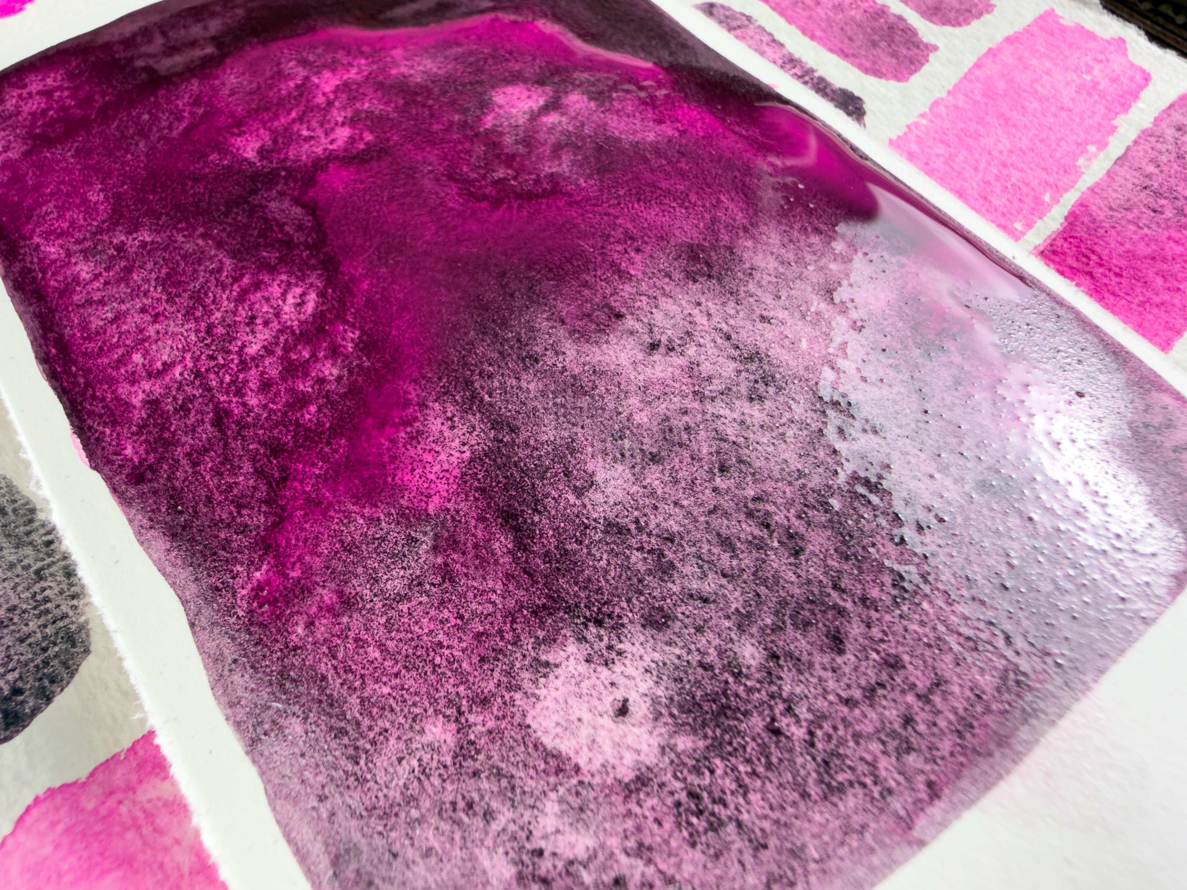 | Nat-in-nat: laat Lunar Black in natte Opera Pink vallen | Granulatie zal bloeien en scheiden - je krijgt een gemarmerde, gestructureerde mix met vlekken, randen en organische variatie. Ideaal voor expressieve, losse stijlen, abstracte bloemen of textuurachtergronden. |