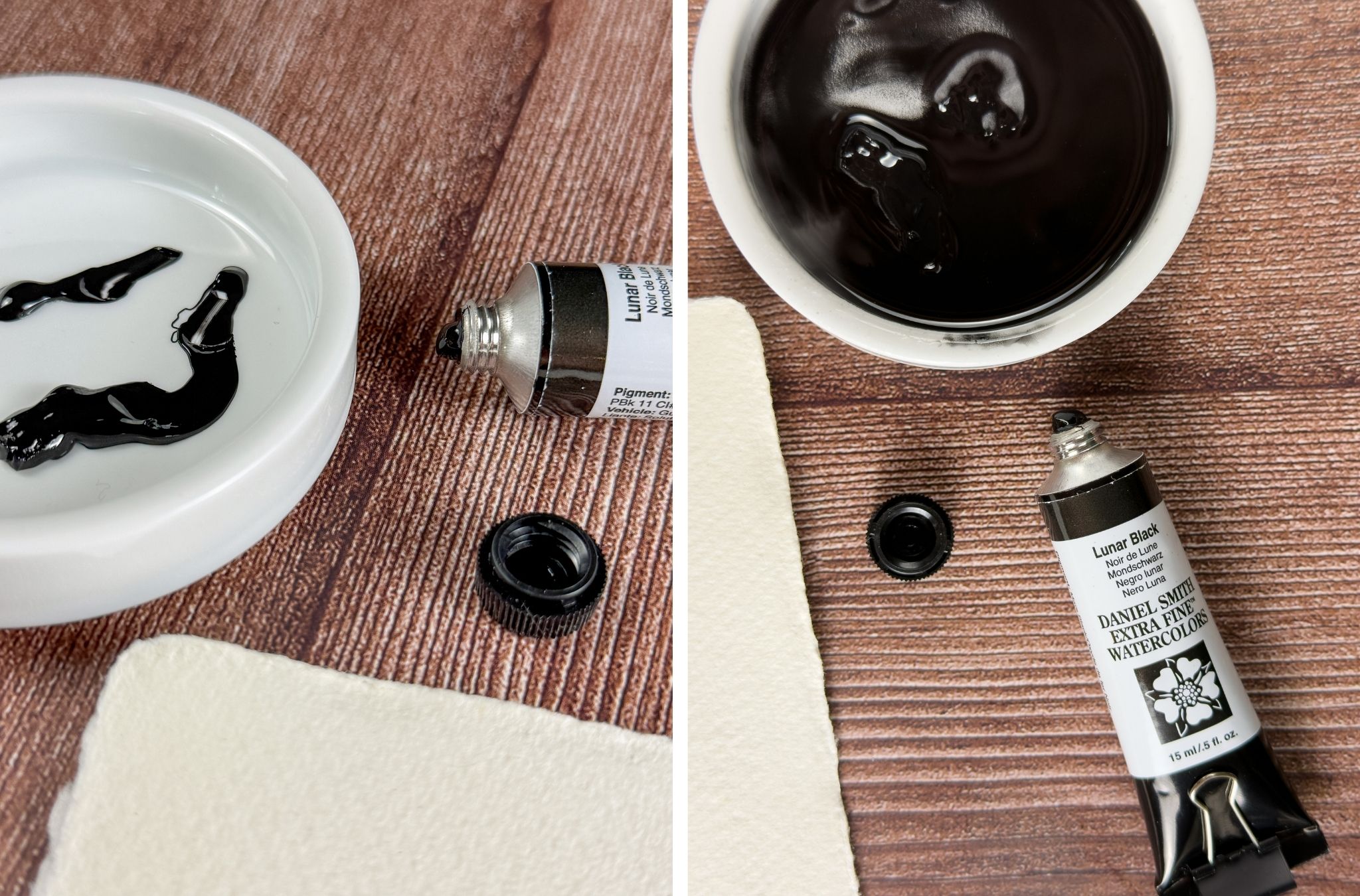 - maan zwart is een transparant, neutraal zwart, gemaakt met een uniek granulerend pigment waarvan de deeltjes zich gedragen als "magnetische krullen" – ze trekken elkaar aan en stoten elkaar af, waardoor een gevlekte, gemarmerde textuur op papier ontstaat. Het lijkt sterk op het oppervlak van de maan, en is echt niet van deze wereld!