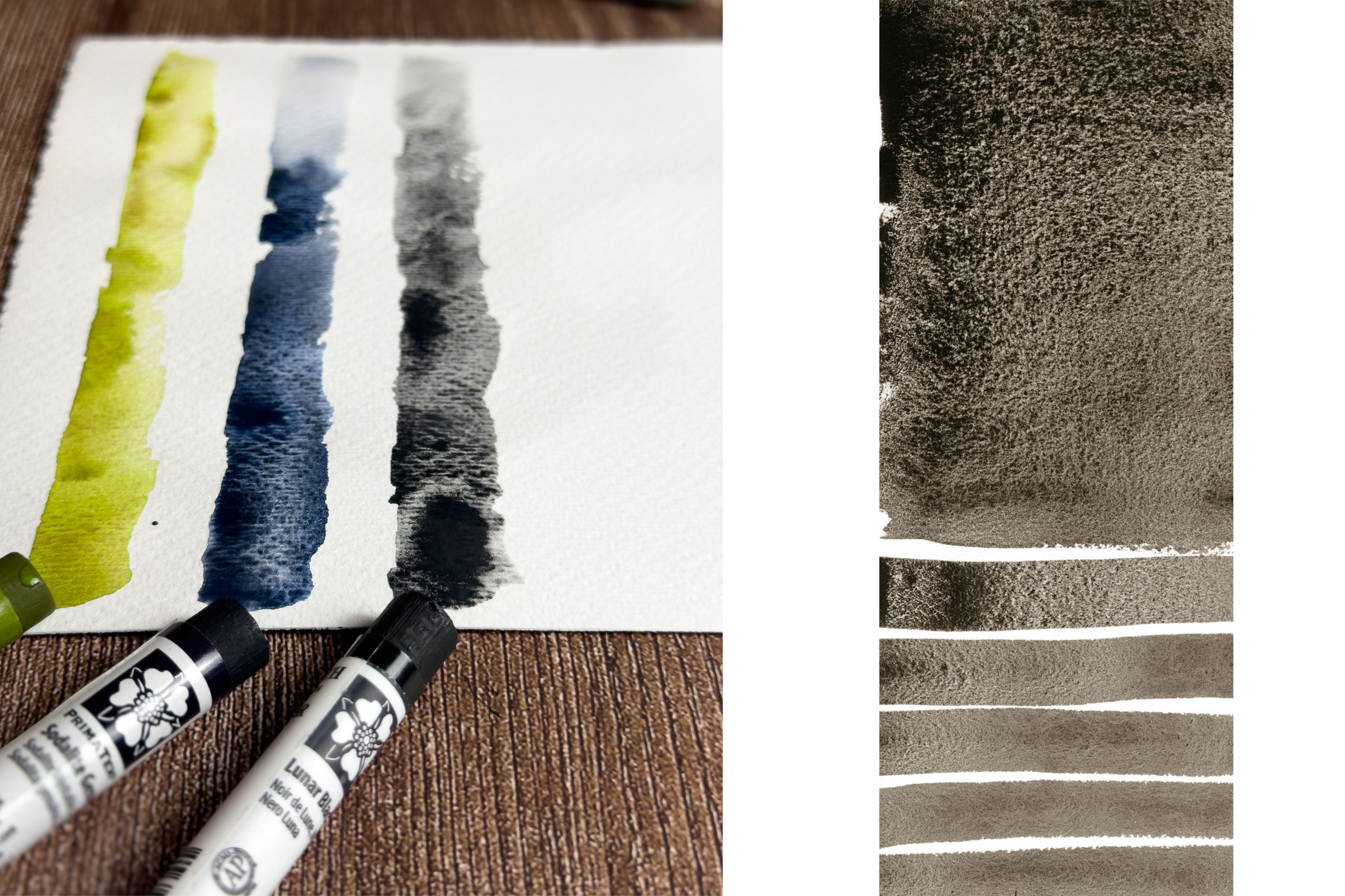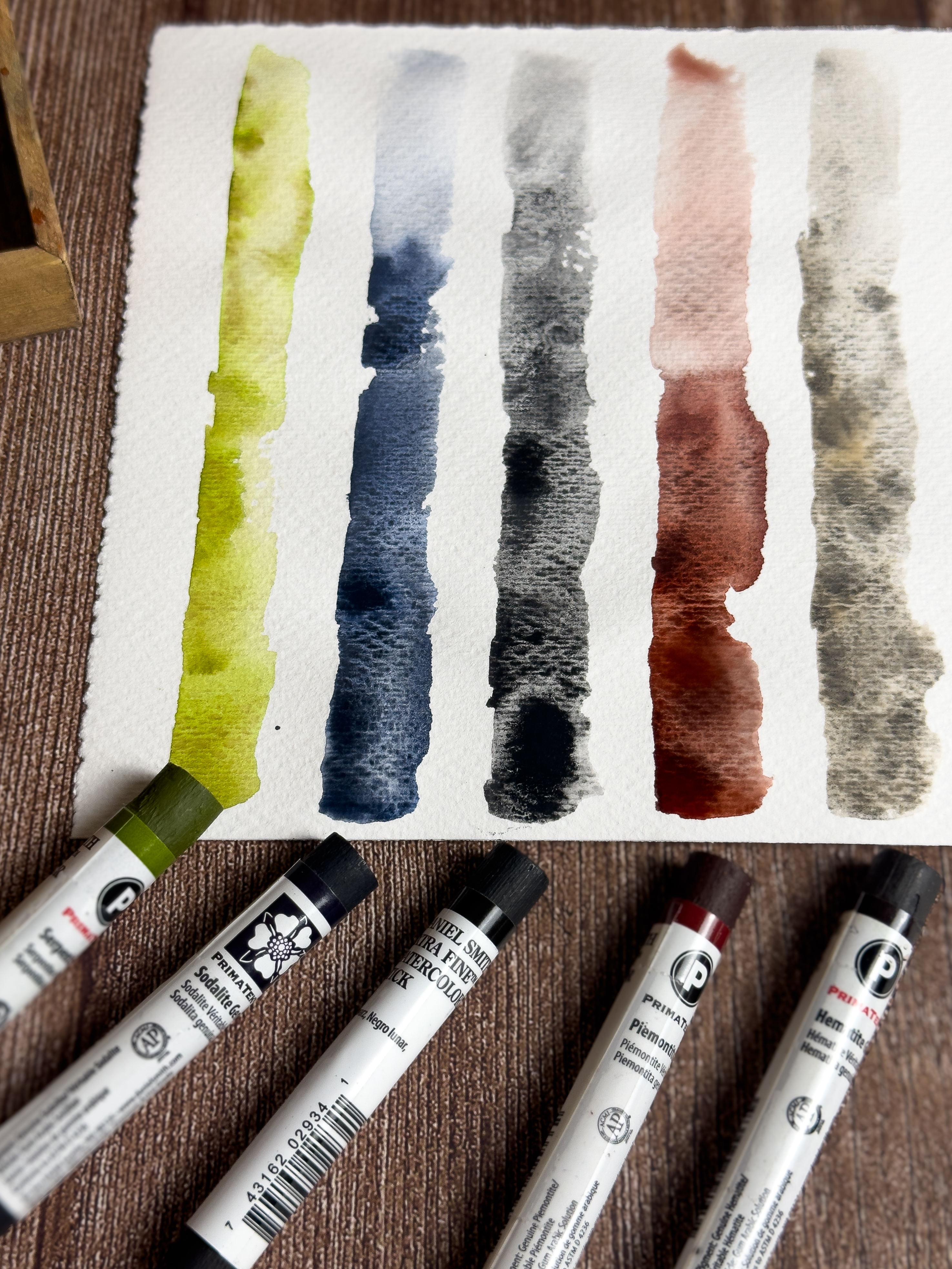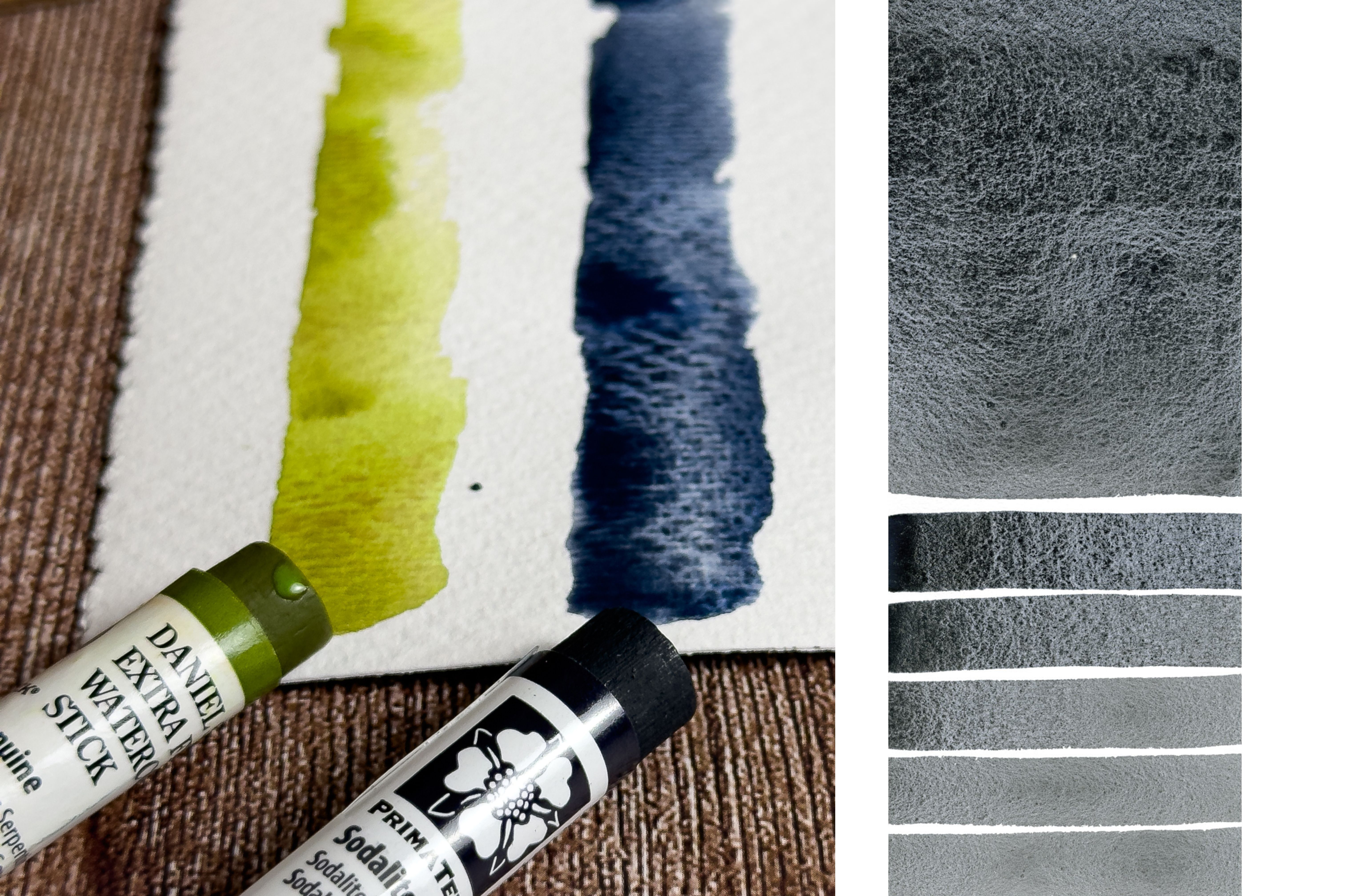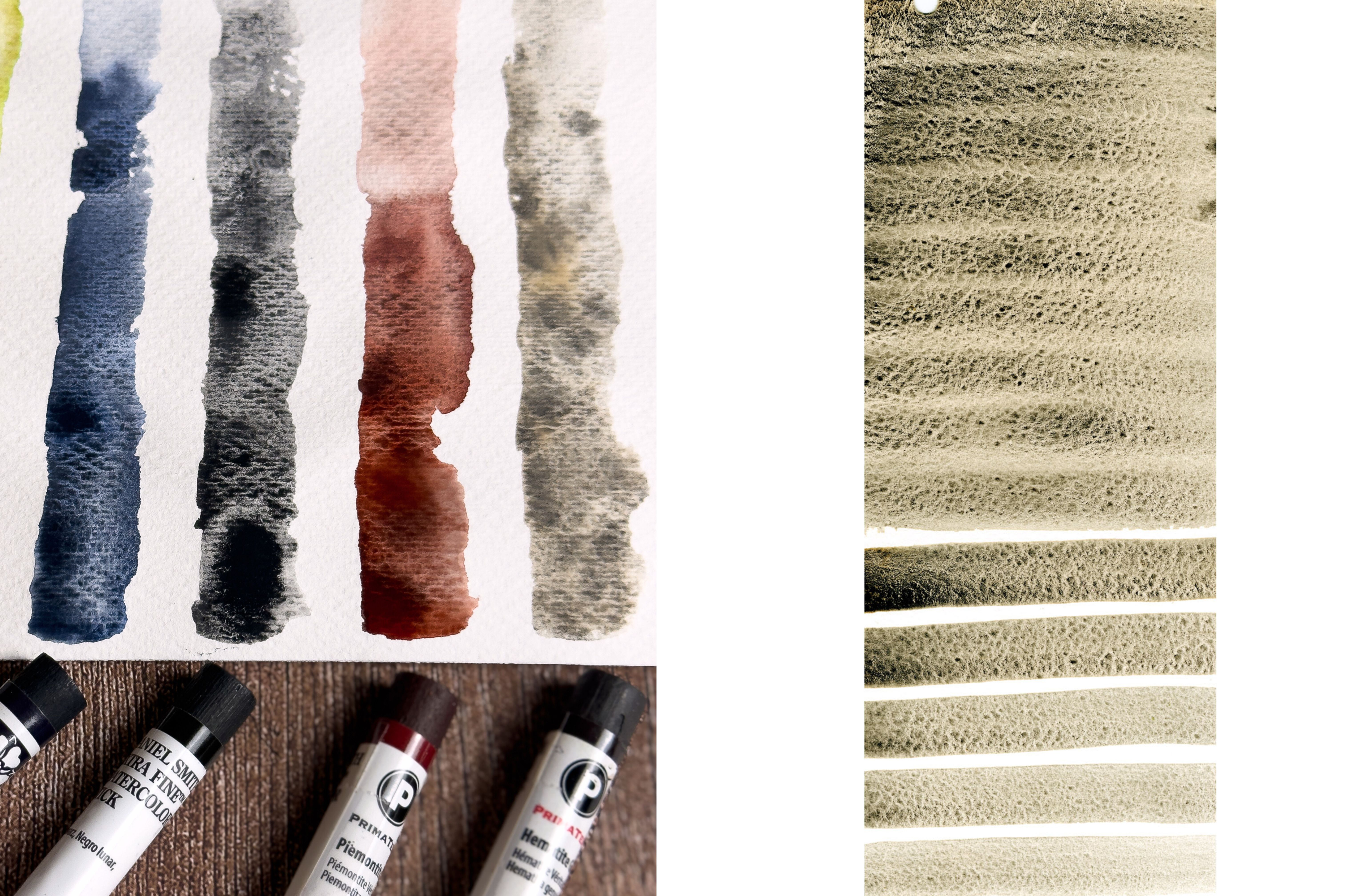 - Mix with restraint: These are strong watercolors full of character; pairing them carefully can yield moody, atmospheric grays and earth tones. For example: