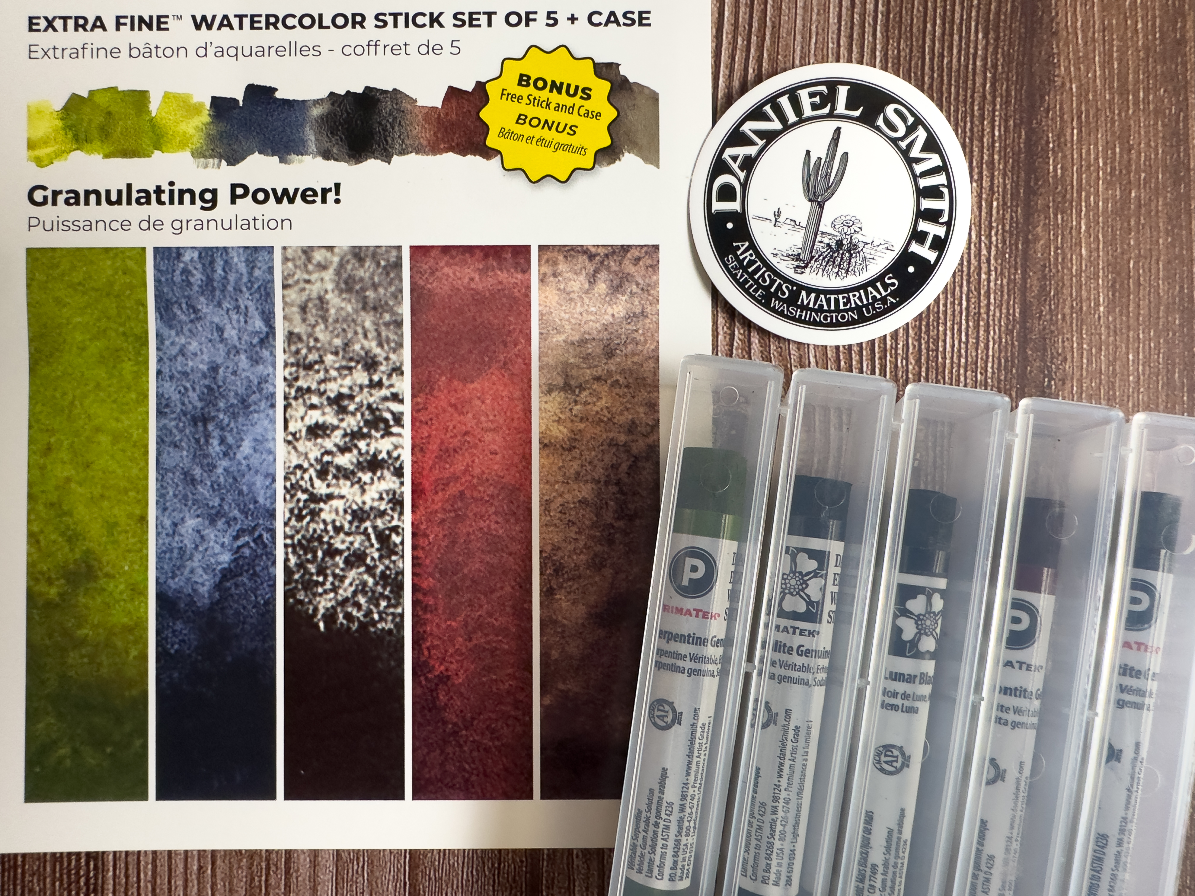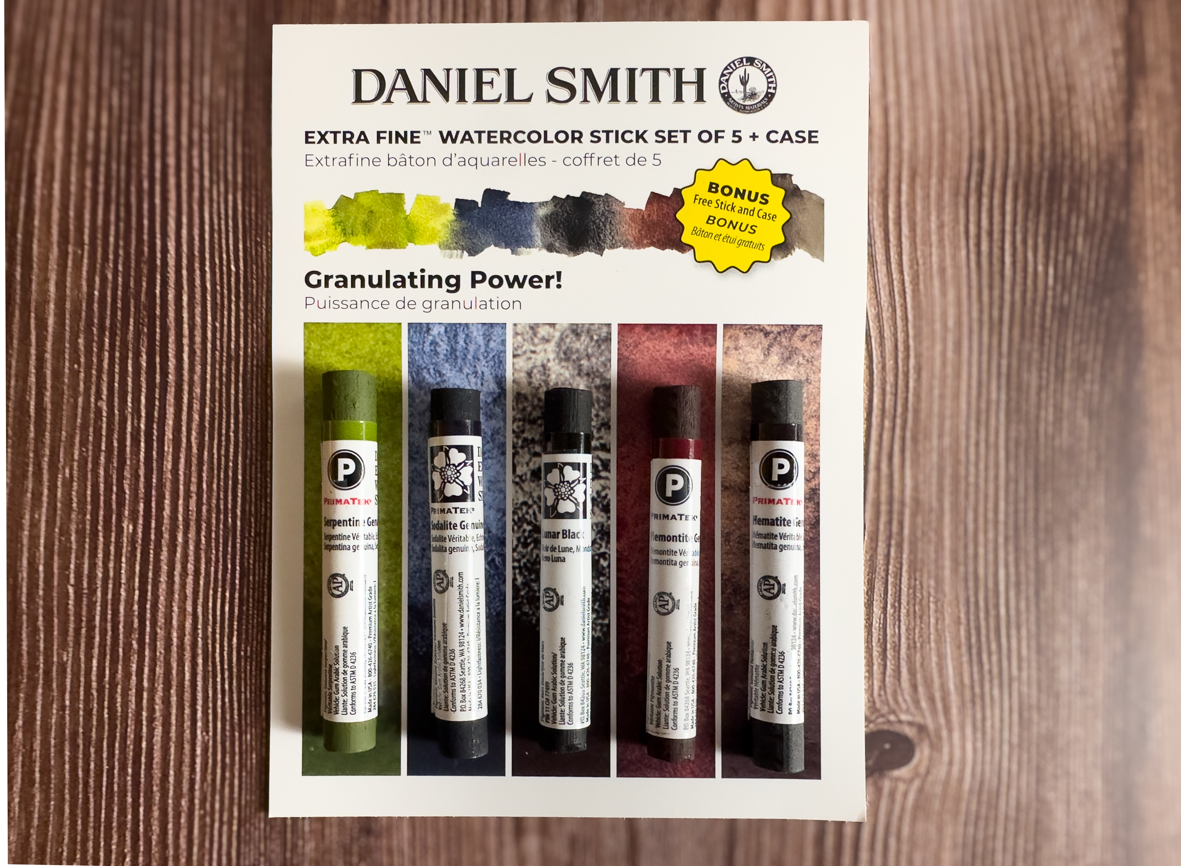 If you’ve ever wanted to add painterly texture — subtle granulation, speckled particles, mineral magic — to your watercolors in a compact, travel-friendly form, the Granulating Power Watercolor Stick Set is a gem in the DANIEL SMITH lineup. This set pairs four PrimaTek watercolors in stick form known for their granulating character with a rich, granulating black to anchor your compositions — all packaged in a snap-lid storage case.