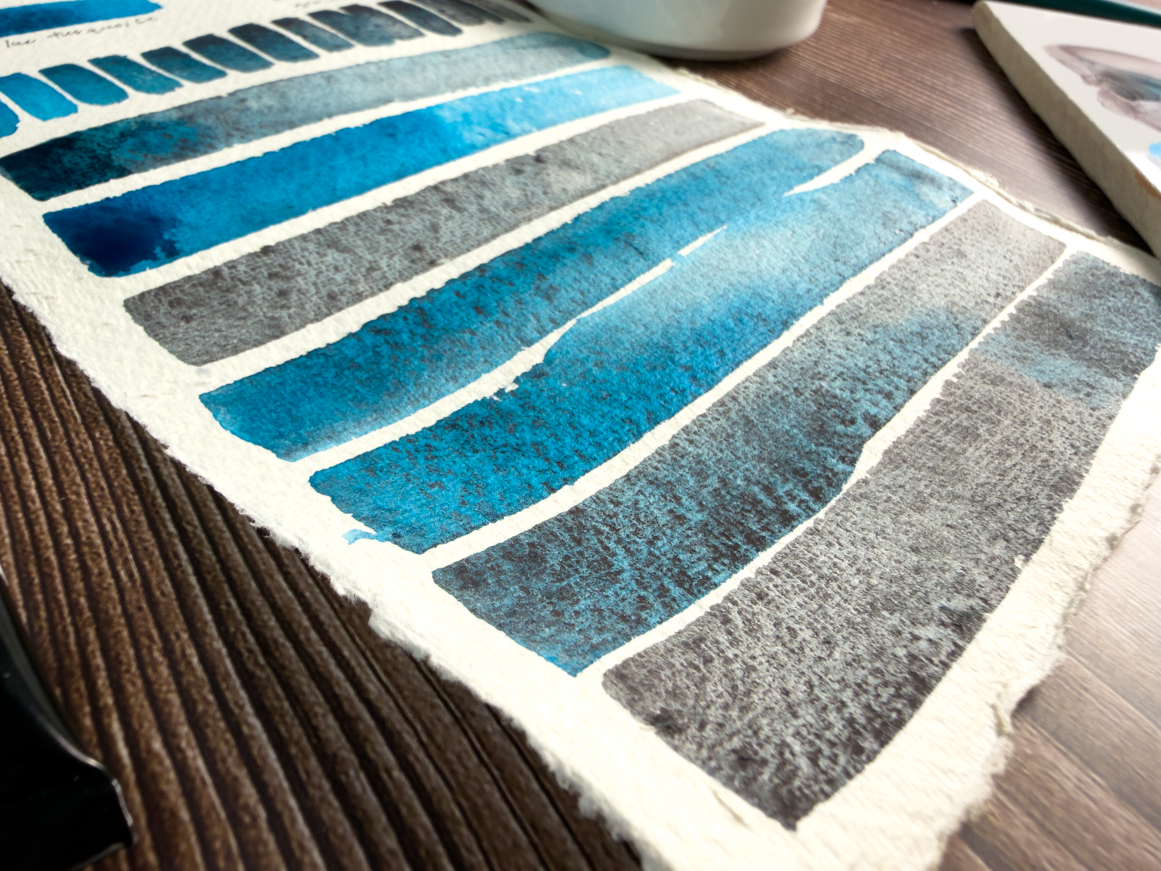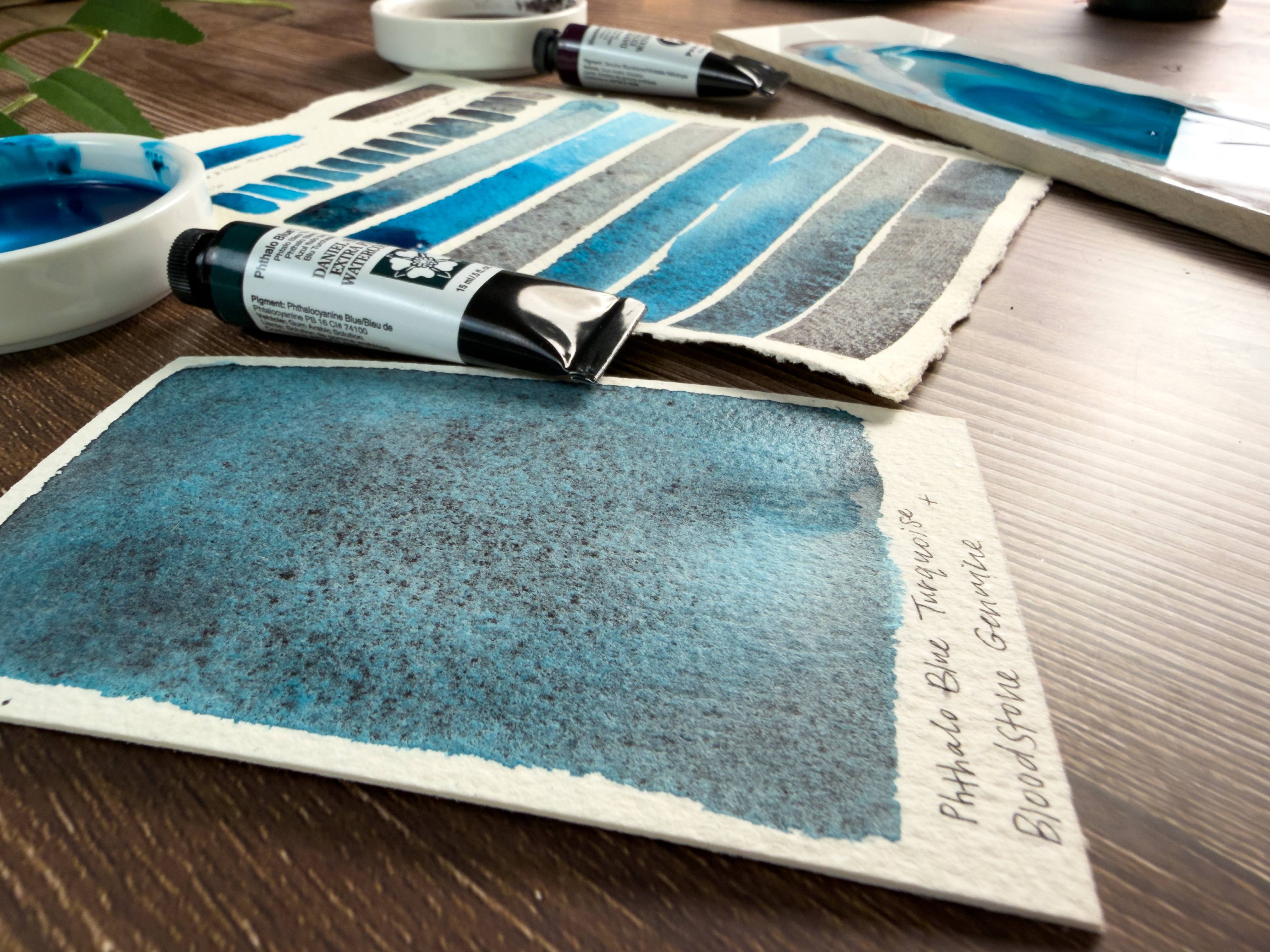 In washes, the granulation of the Bloodstone breaks apart beautifully, adding texture that feels earthy—like shifting sands beneath clear water or distant mountain shadows. Depending on the ratio, you can create everything from icy teals and slate blues to moody, weathered neutrals
