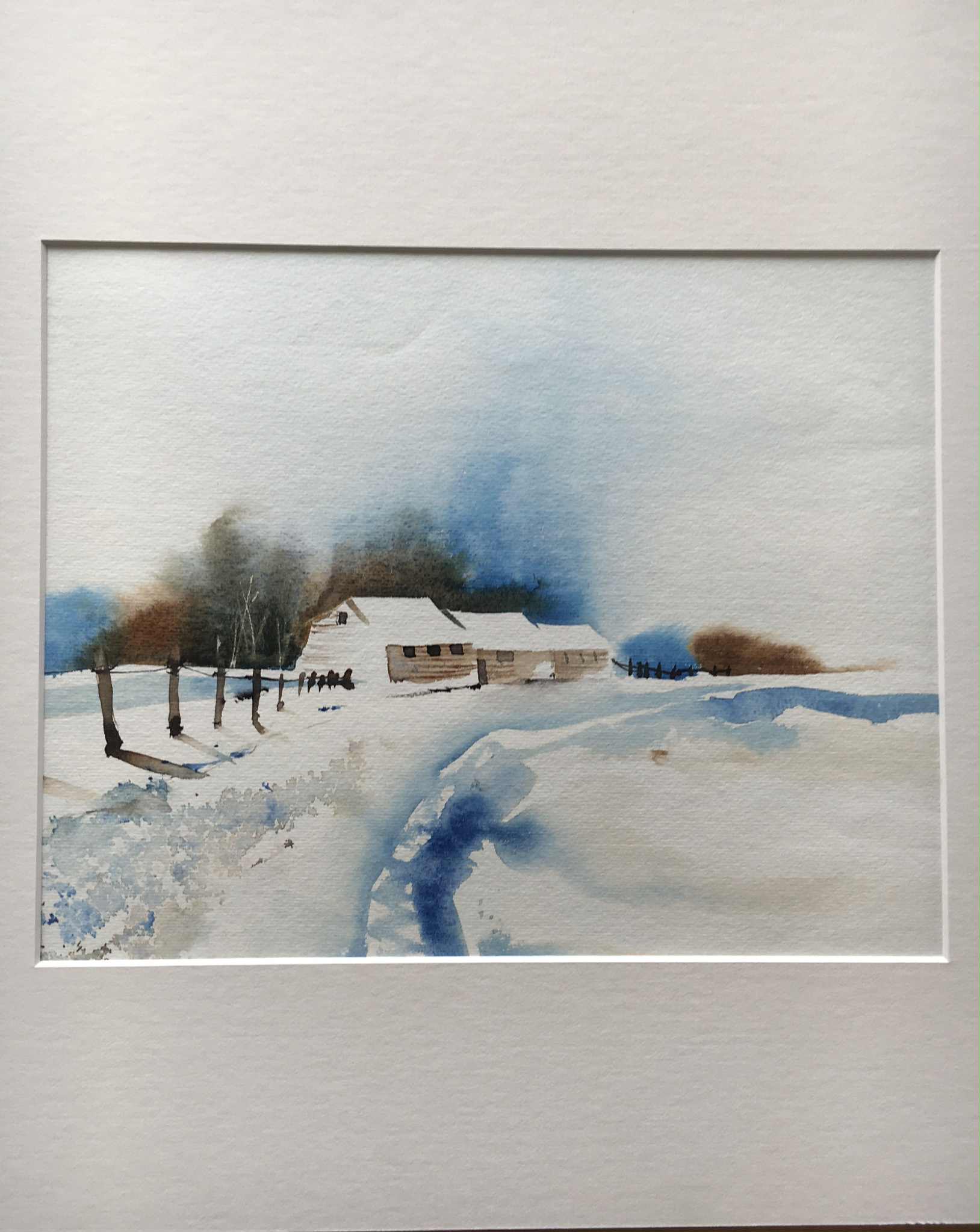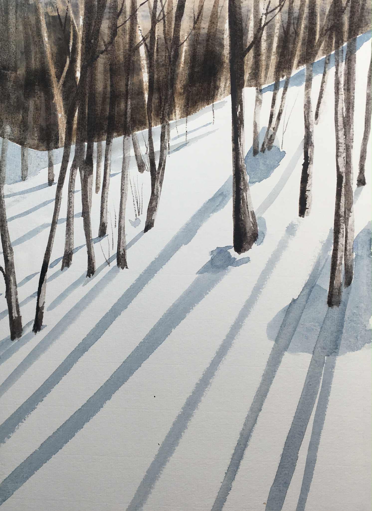 - Shadows are painted with transparent cool washes—never heavy or opaque—so the snow feels airy and luminous.