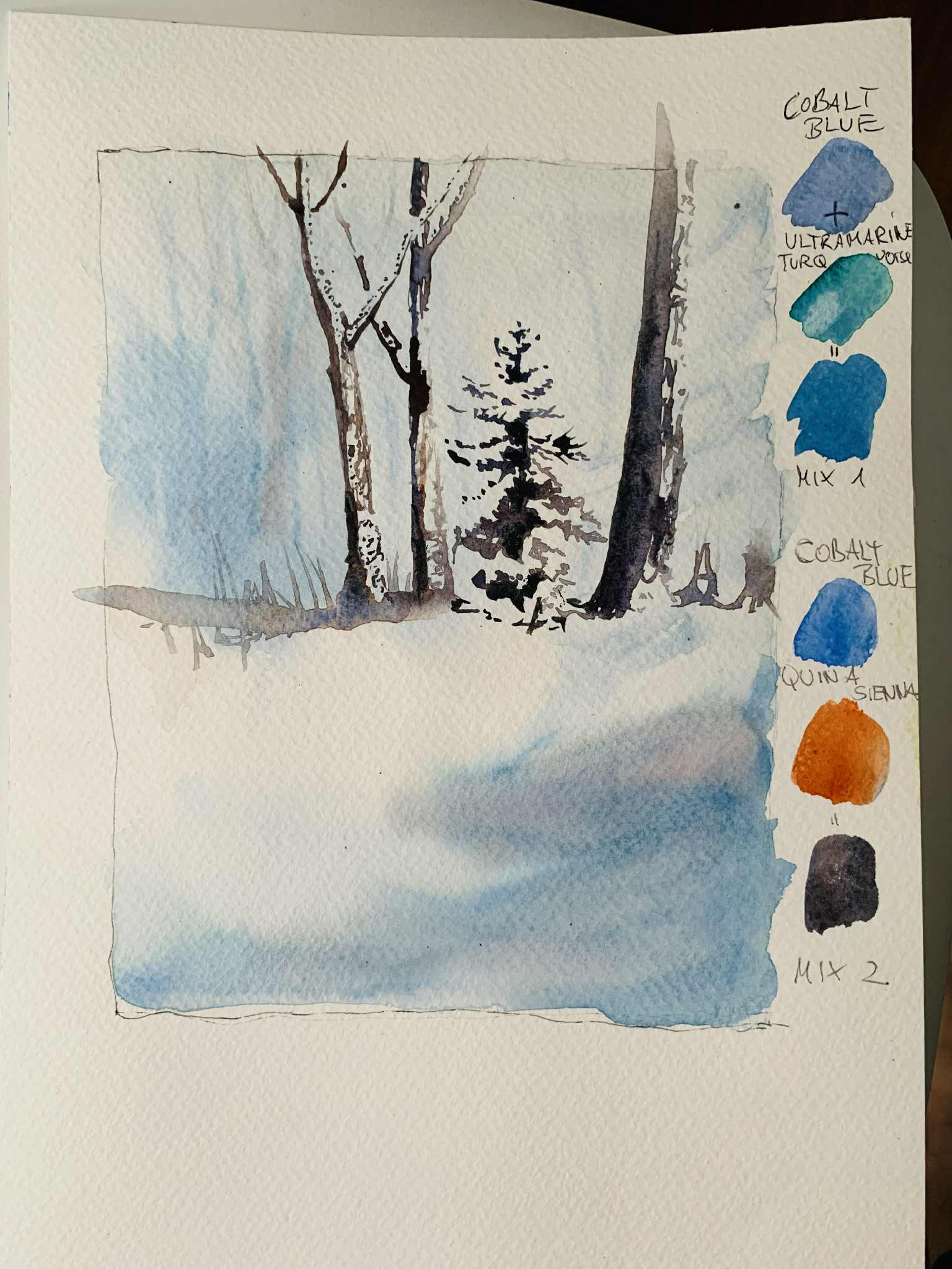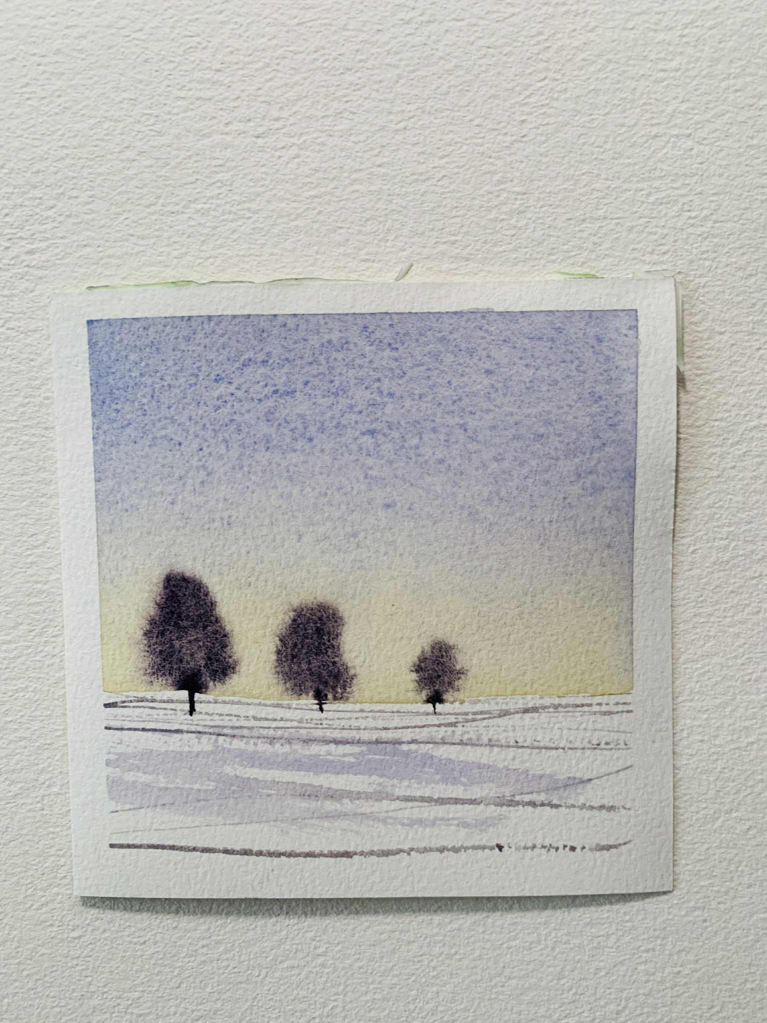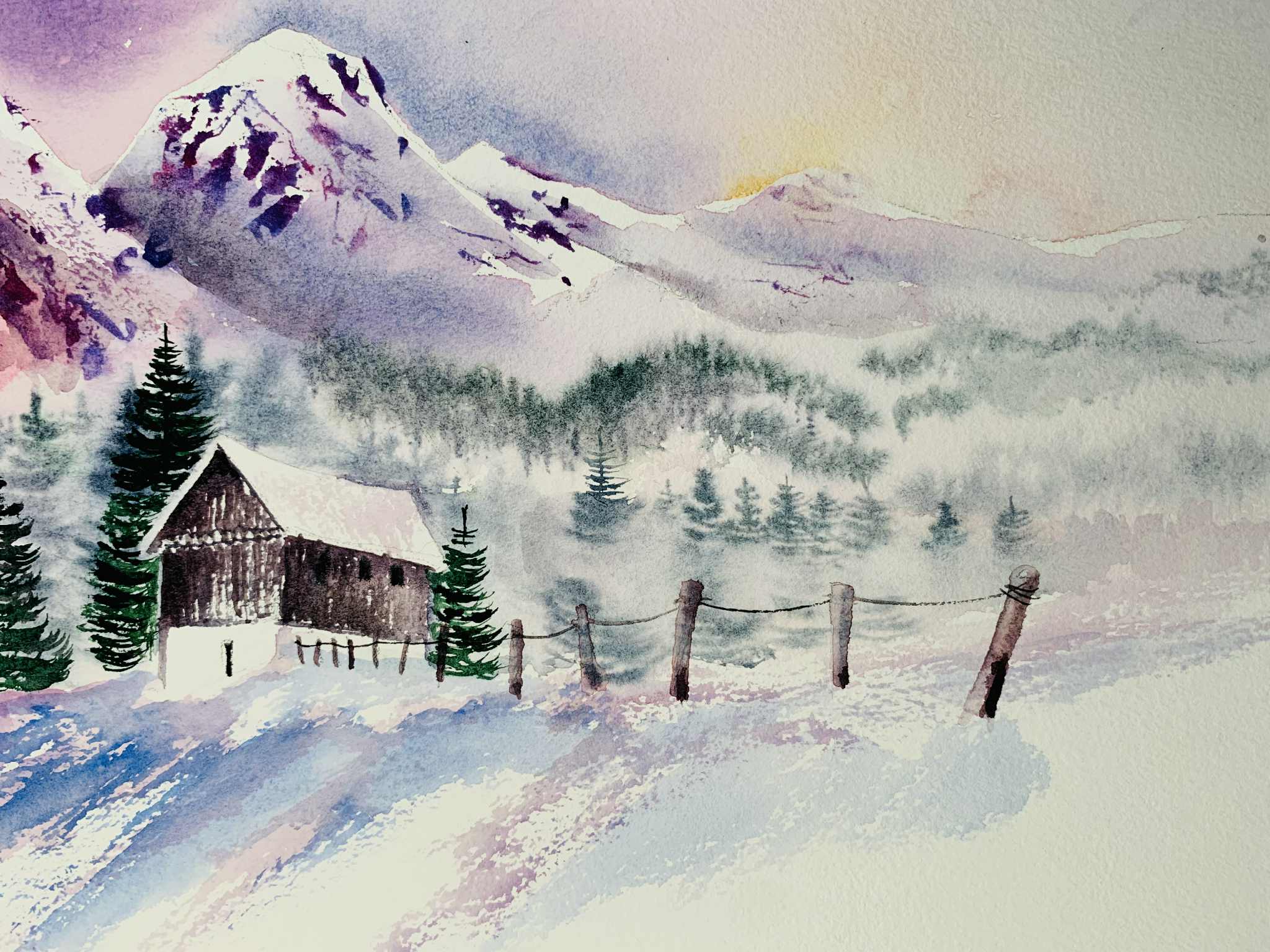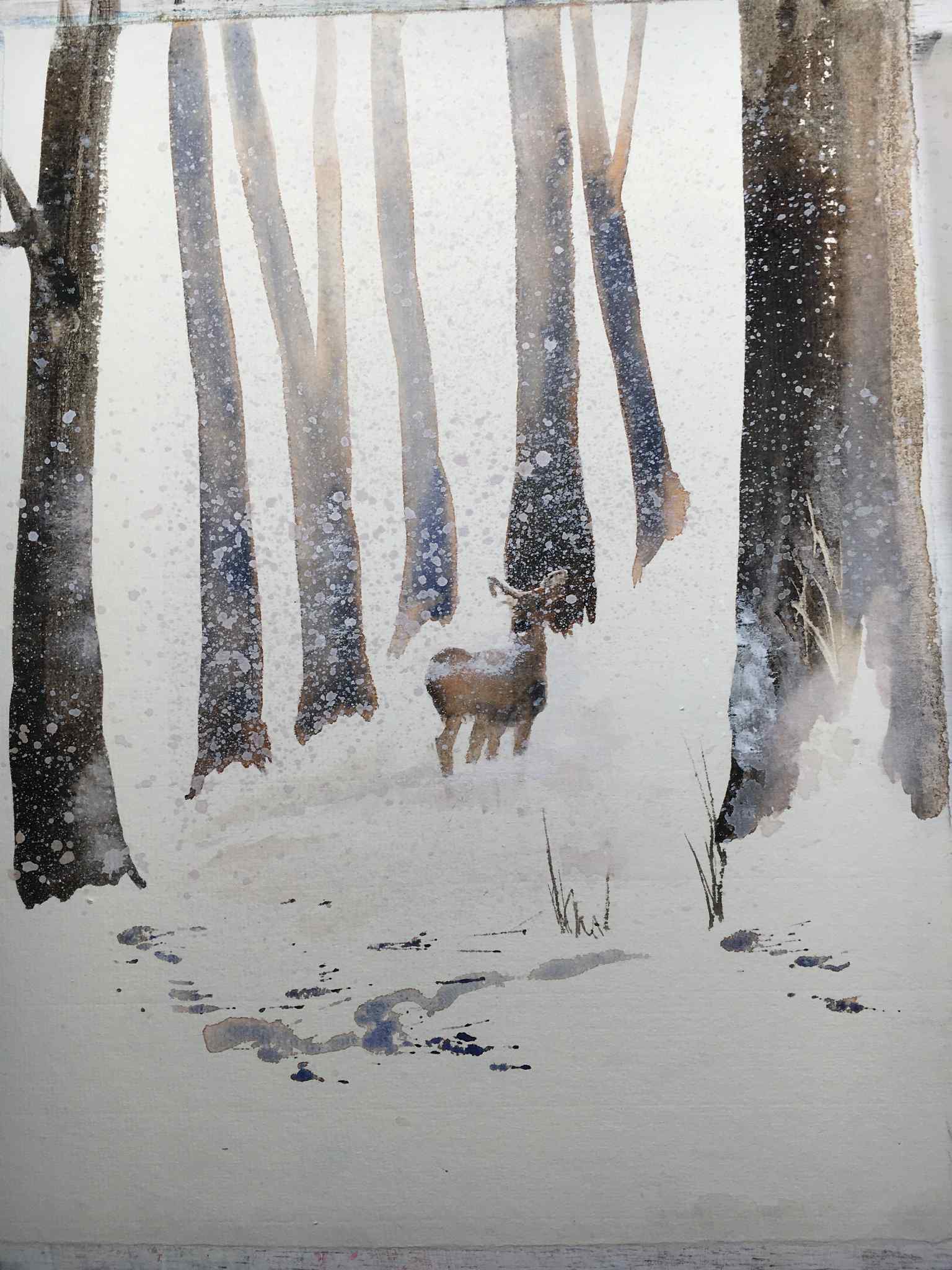- Wet-into-wet washes give the sky and distant forest a gentle blur, perfect for misty, cold days.